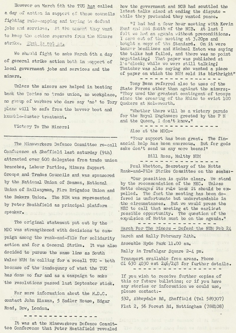 A newsletter “Socialist Organiser -Miners Strike Bulletin” 11th-17th February from the Miners Strike in the UK in 1985. It gives details of forthcoming strike action and other pieces about the miners struggle.