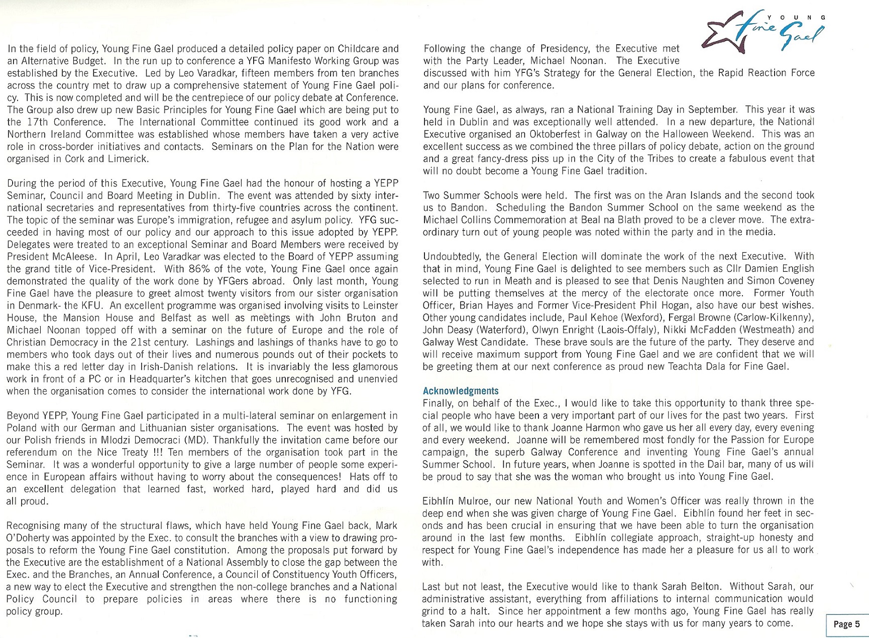 From the 2001 Young Fine Gael National Conference a two page article by Leo Varadkar on The performance of The National Executive I’ve uploaded it in pdf here