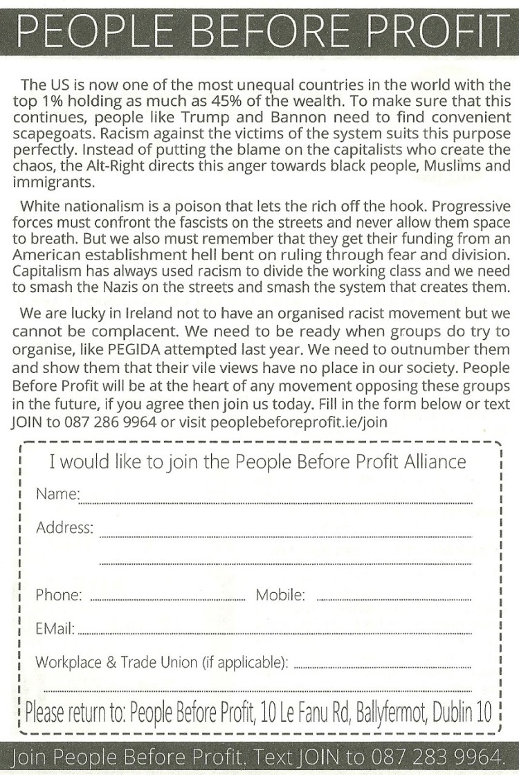“Nazis’ Emboldened in Trump’s America” a Leaflet from People Before Profit regarding the death of Heather Heyer and Trumps failure to condemn the fascists and white supremacists responsible.