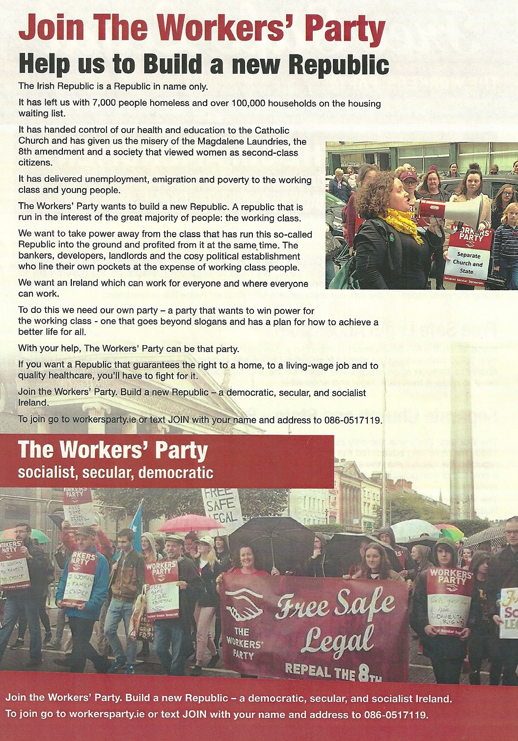 A “Free Safe Legal” Repeal The 8th Amendment leaflet from The Workers Party, outlining their pro-choice stance and what else the Party stands for.