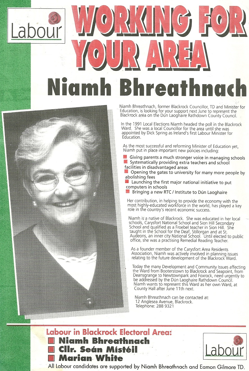 Leaflet from Niamh Bhreathnach -Labour Party -1999 Local Elections -Blackrock » TrafficLab99a