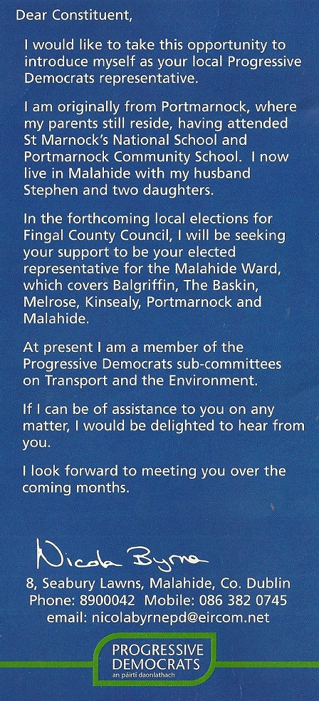 Leaflet from Nicola Byrne -Progressive Democrats – Malahide -2004 Local Elections » Nbyrne04b