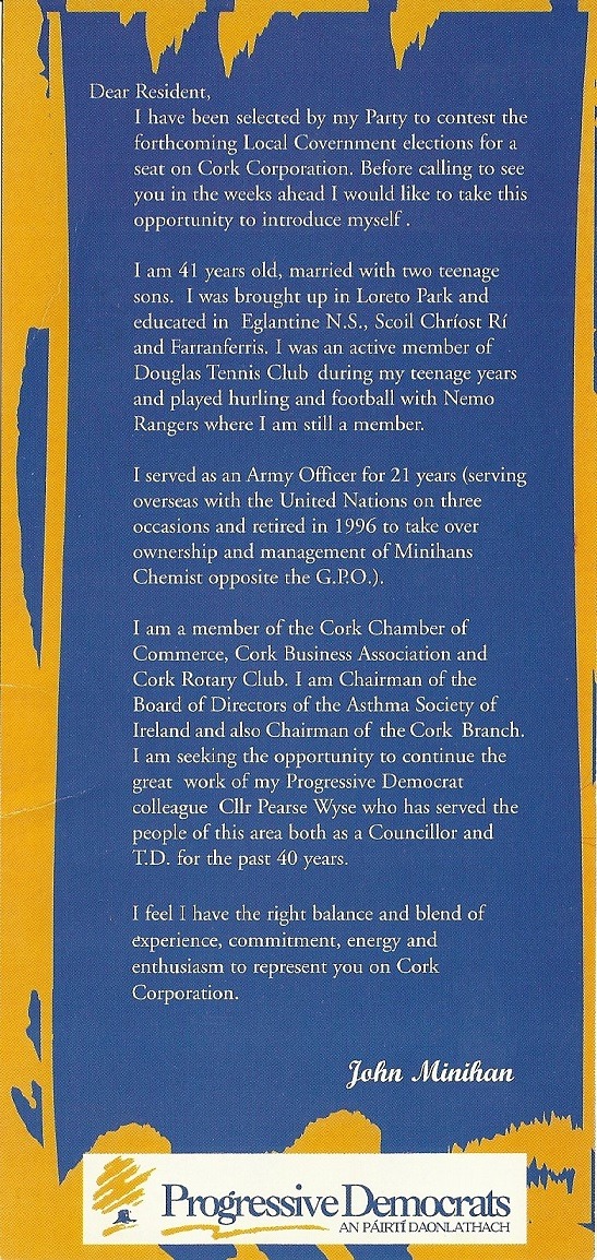 Leaflet from John Minihan- Progressive Democrats -1999 Local Elections- Cork South East » jminihan2