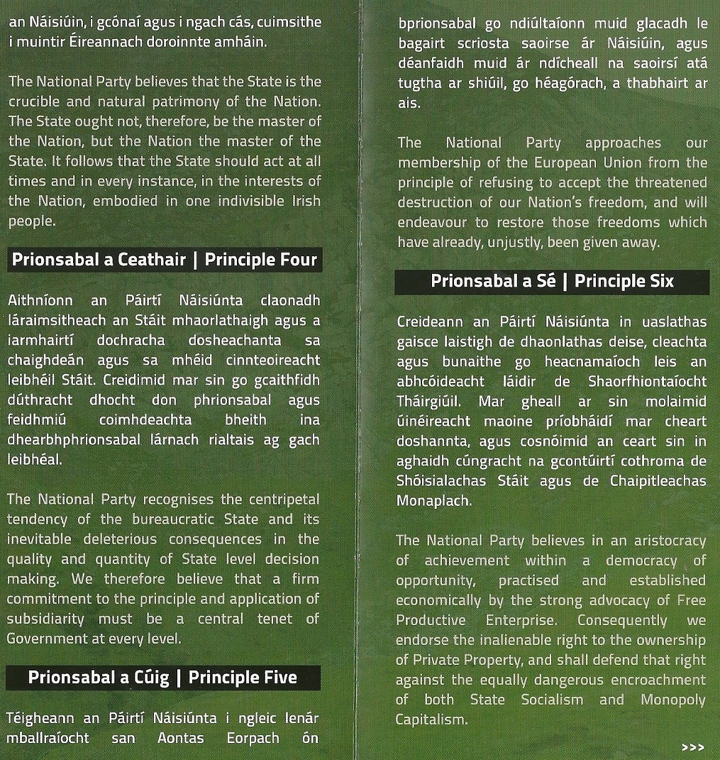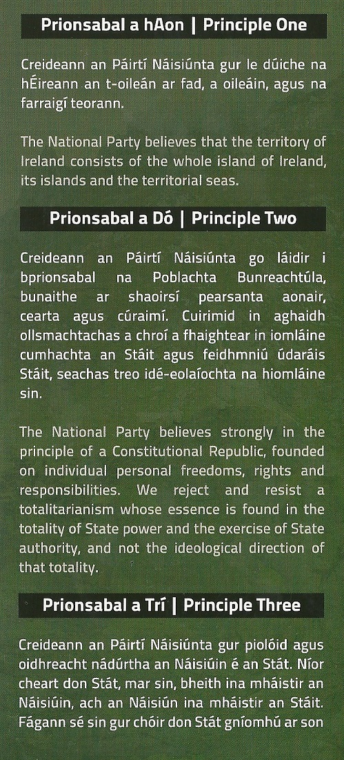 A leaflet as bearla agus as gaelige from The National Party outlining the party’s nine main principles.