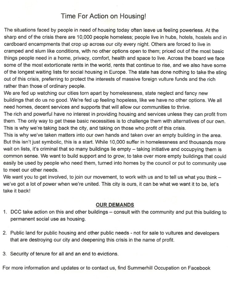 A leaflet produced by the various groups involved in the Summerhill Occupation outlining the reasons behind the occupation and their three demands.