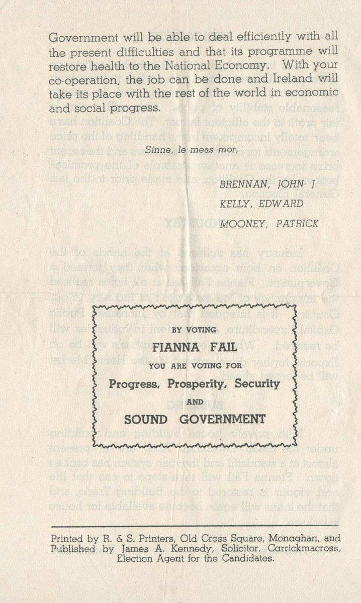 From the 1957 General Election a leaflet for John Brennan, Edward Kelly and Patrick Mooney who were running for Fianna Fail in Monaghan.