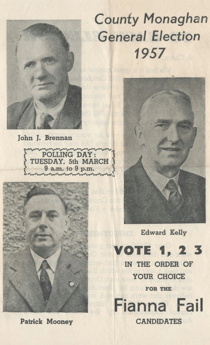 Leaflet for John Brennan, Edward Kelly , Patrick Mooney – Fianna Fail -Monaghan -1957 General Election » Monaghan57FF1