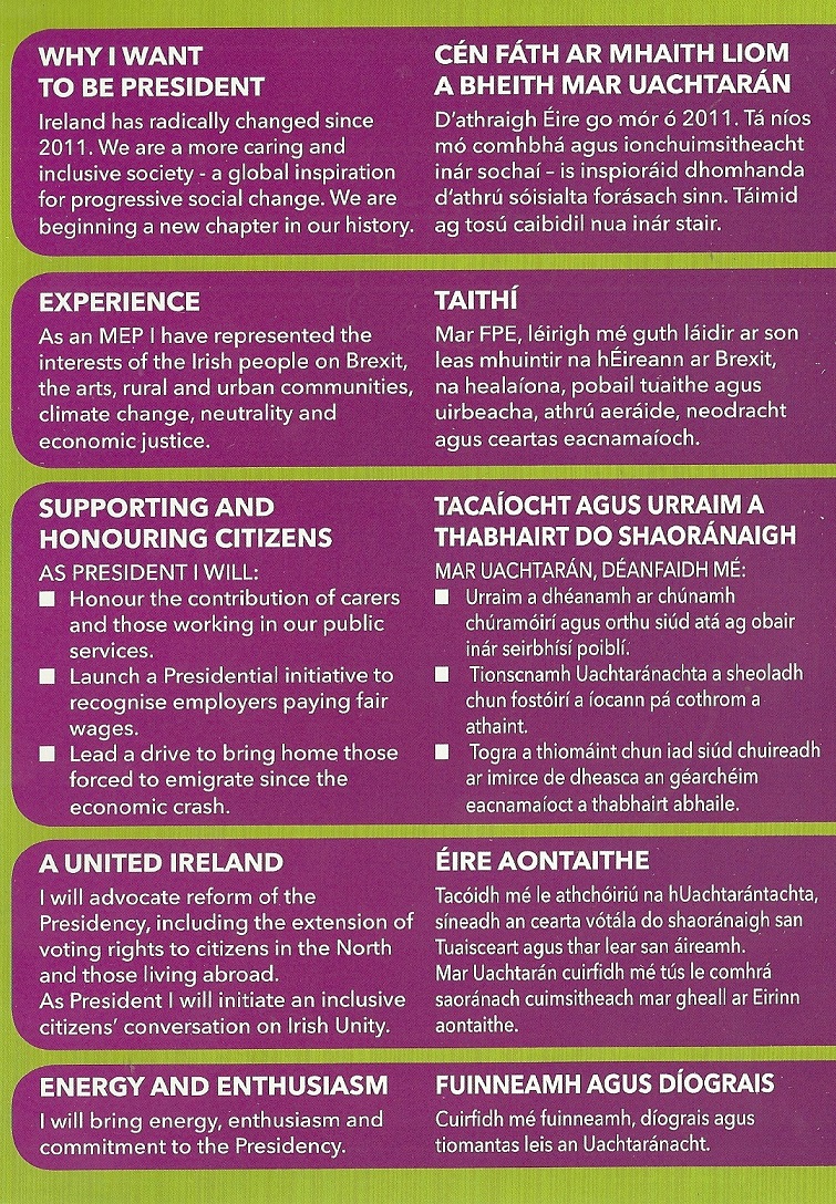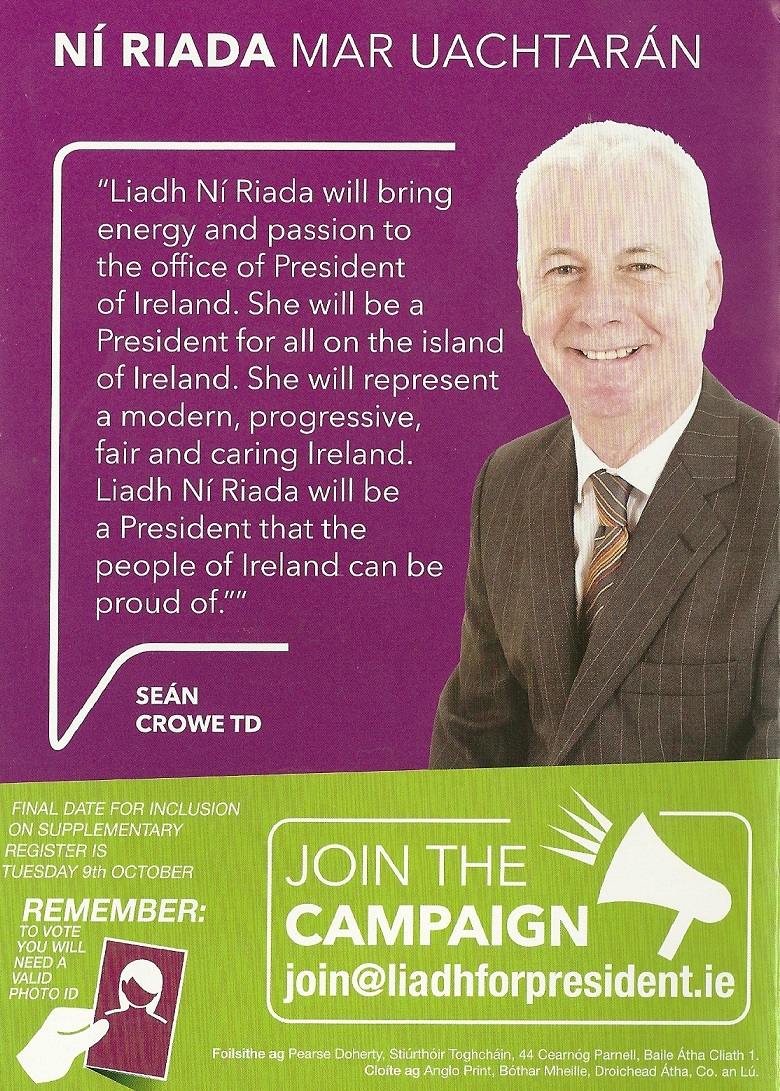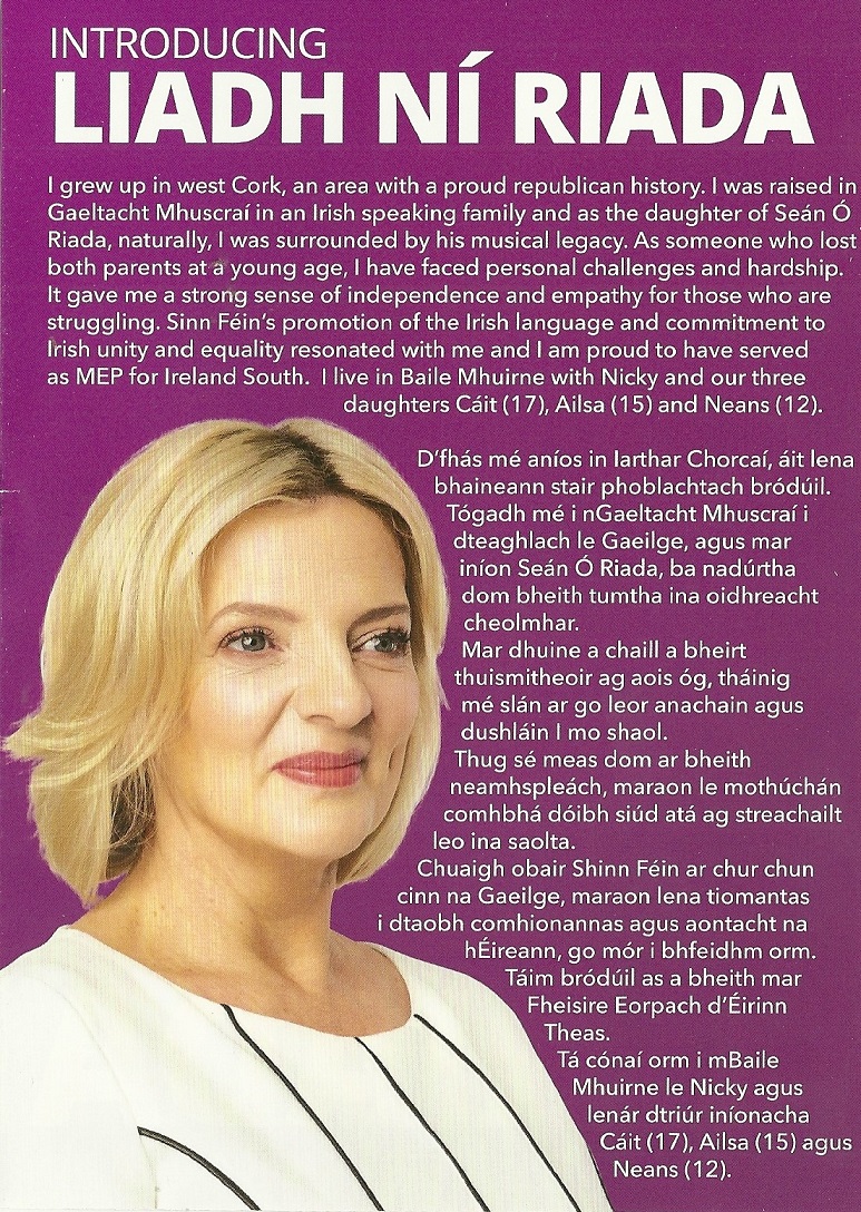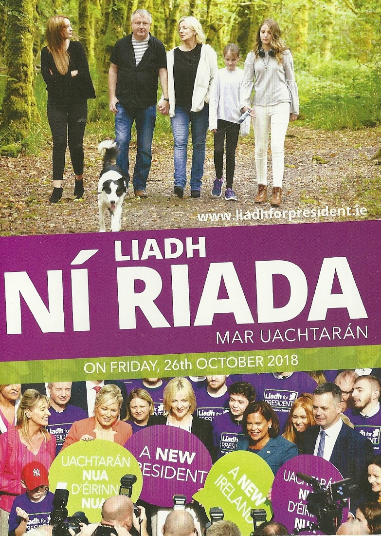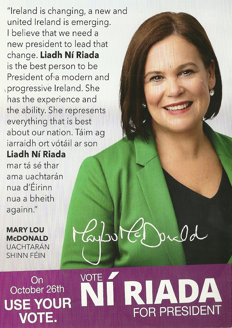 From the 2018 Presidential Election Campaign, a leaflet from Liadh Ní Riada. She is currently a Sinn Féin MEP for Ireland South.