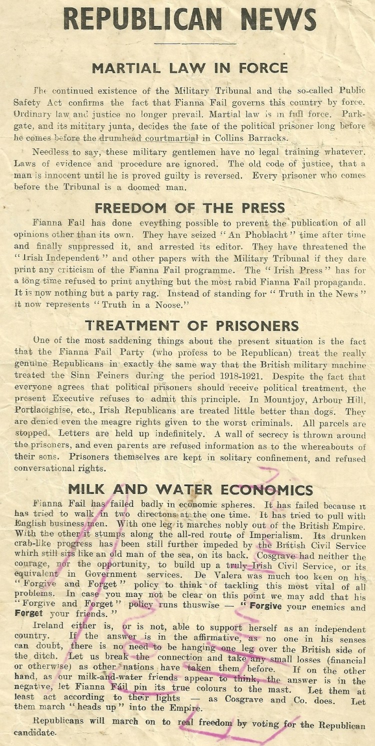 From 1937 (The IRA was banned in 1936) a copy of Republican News that was just a single sheet of paper, probably illustrating the difficulty trying to print a full paper at the time.