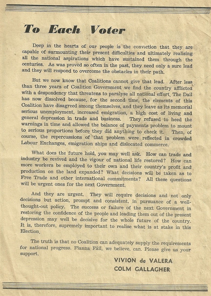 Leaflet from Vivion de Valera and Colm Gallagher -Fianna Fail -1957 General Election -Dublin North Central » 1957VivionDevCGallagher2