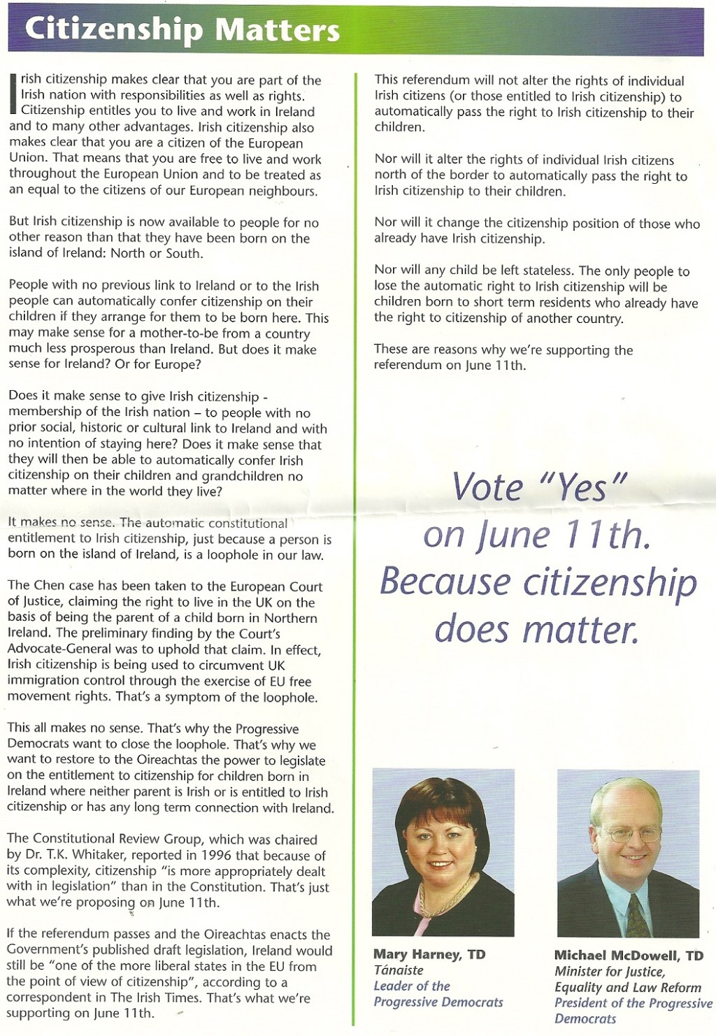 “Yes Citizenship Matters” Leaflet from the Progressive Democrats -2004 Citizenship Referendum » citizenshiprefpds2