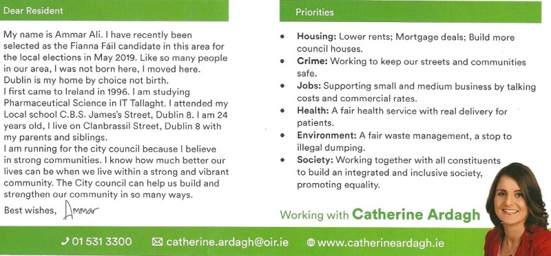 A leaflet from Ammar Ali who is running in the 2019 Local Elections in The Dublin South West Inner City Ward for Fianna Fáil.
