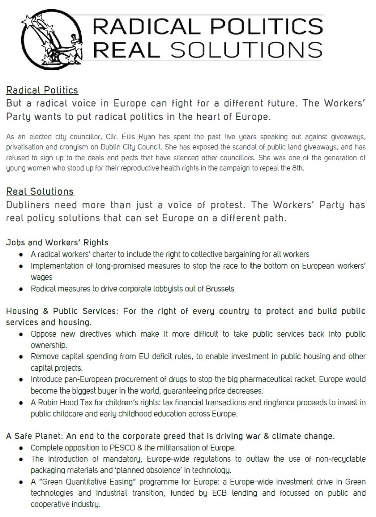 A leaflet from Cllr Éilis Ryan who is running for The Workers’ Party in Dublin in the 2019 European Elections.