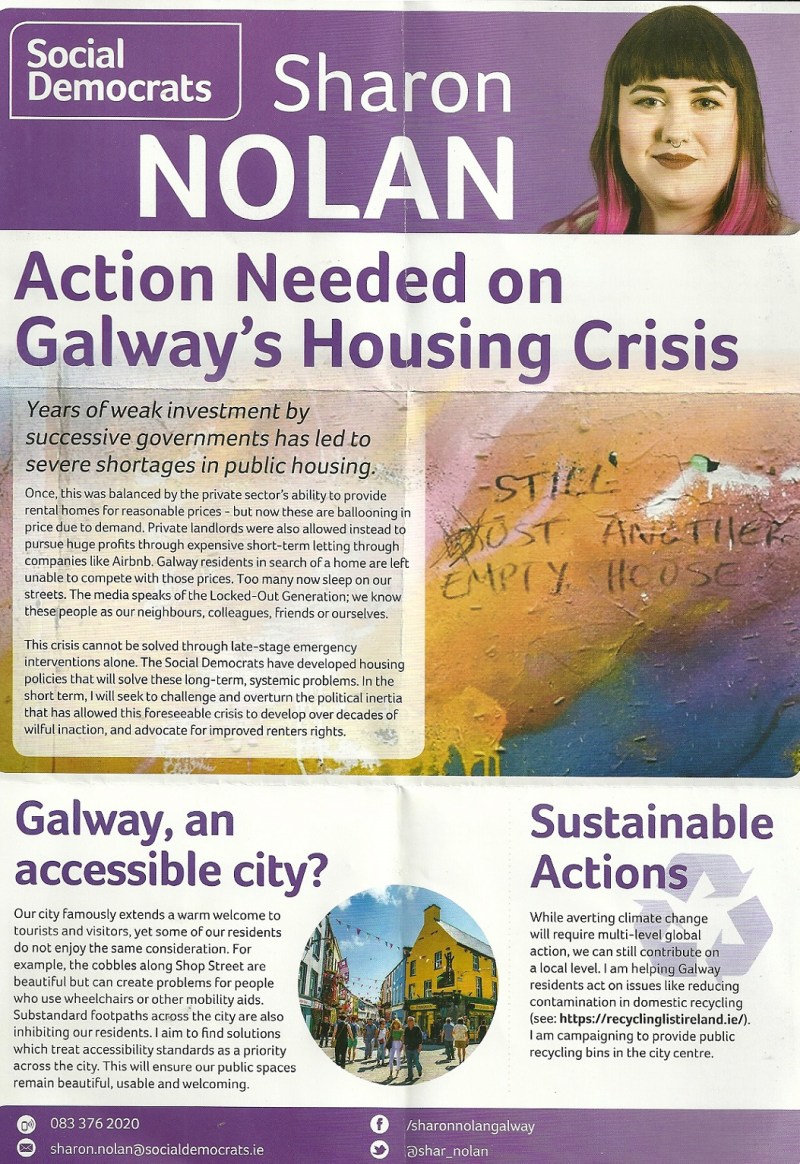 A Leaflet from Sharon Nolan who is running in the Galway City Central LEA for The Social Democrats in the 2019 Local Elections.