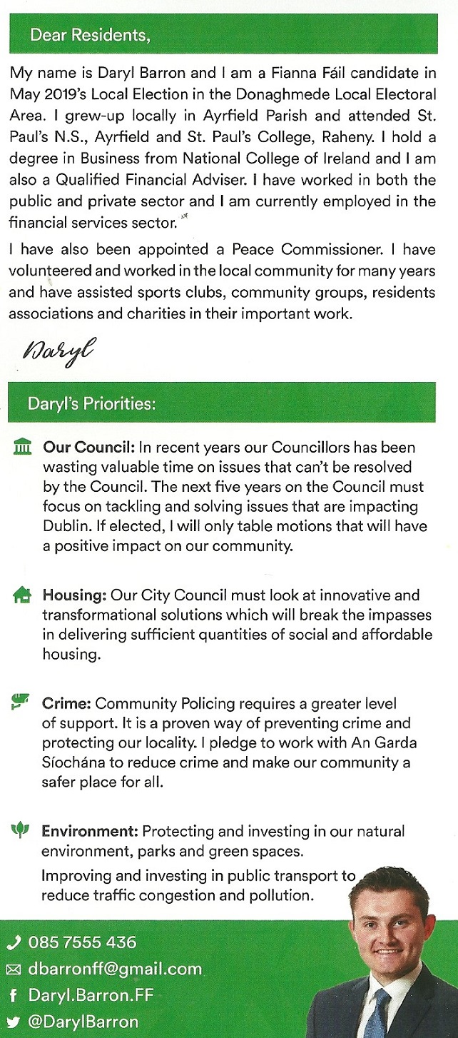 Leaflet from Daryl Barron – Fianna Fáil -Donaghmede #LE19 » DarylBannon2
