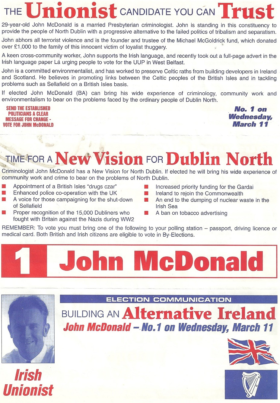 Leaflet from John McDonald -Irish Unionist- 1998 Dublin North By-Election » JohnMcDonald1