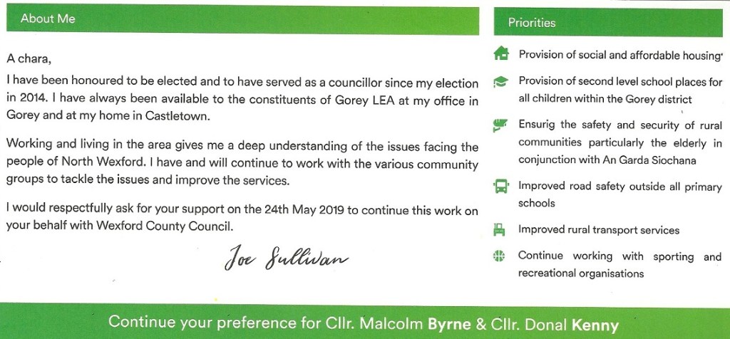 Leaflet from Joe Sullivan – Fianna Fáil – Gorey #LE19 » JoeSullivan2