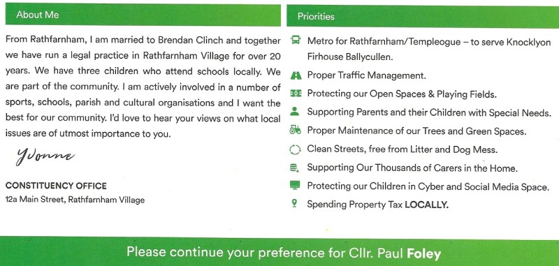 A Leaflet from Yvonne Collins who is running for Fianna Fáil in Rathfarnham Templeogue for a seat on South Dublin County Council