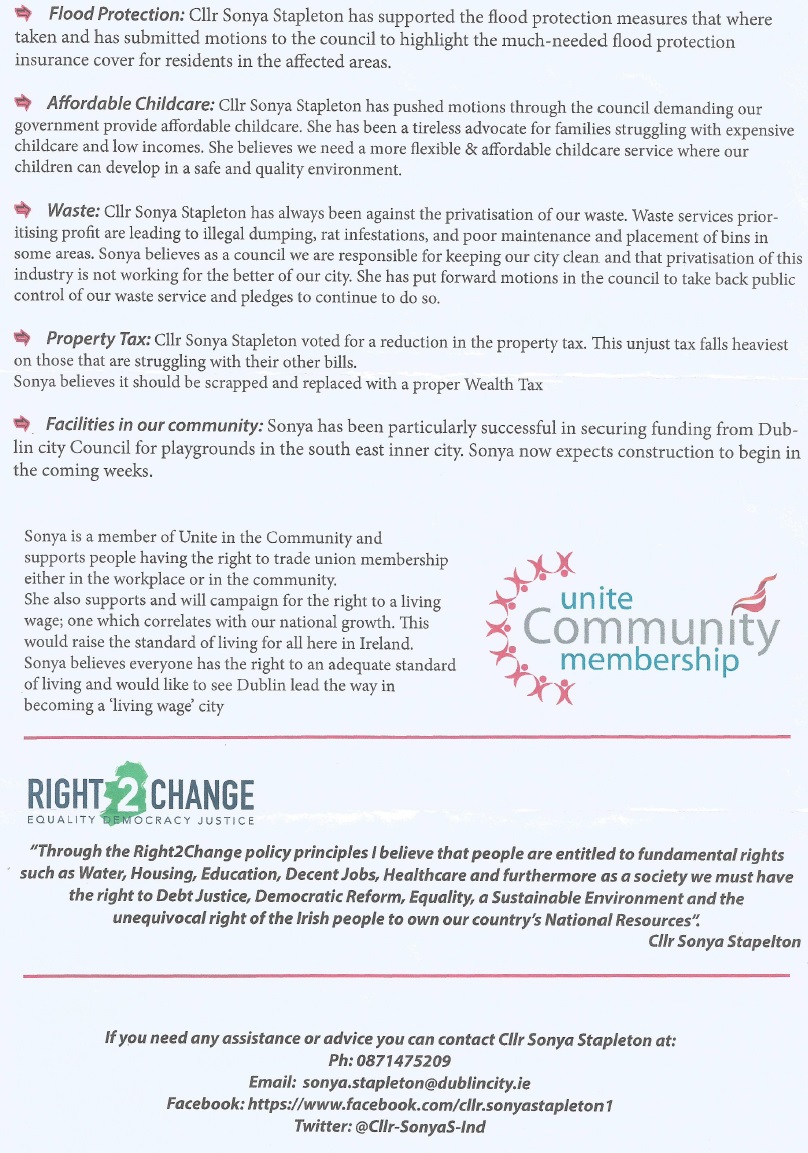 Leaflet from Sonya Stapleton -Independents4Change – South East Inner City #LE19 » SonyaStapleton2