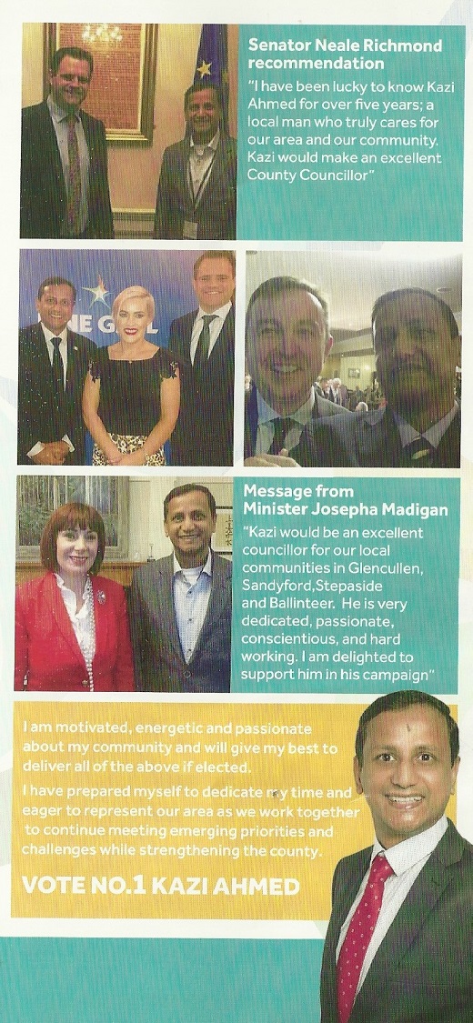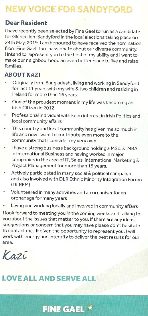 A Leaflet from Kazi Ahmed who is running for Fine Gael in The Glencullen/Sandyford LEA for a seat on Dun Laoghaire Rathdown County Council.