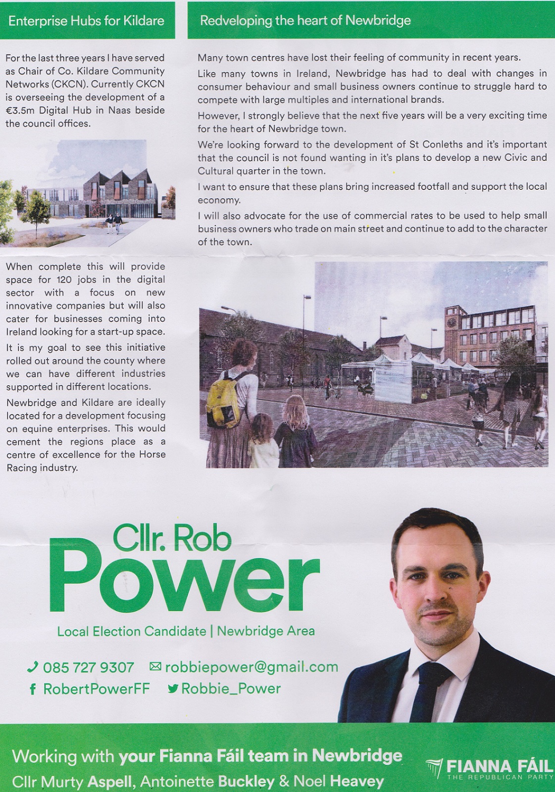 A Leaflet from Rob Power of Fianna Fáil who is running in Newbridge to retain his seat on Kildare County Council.