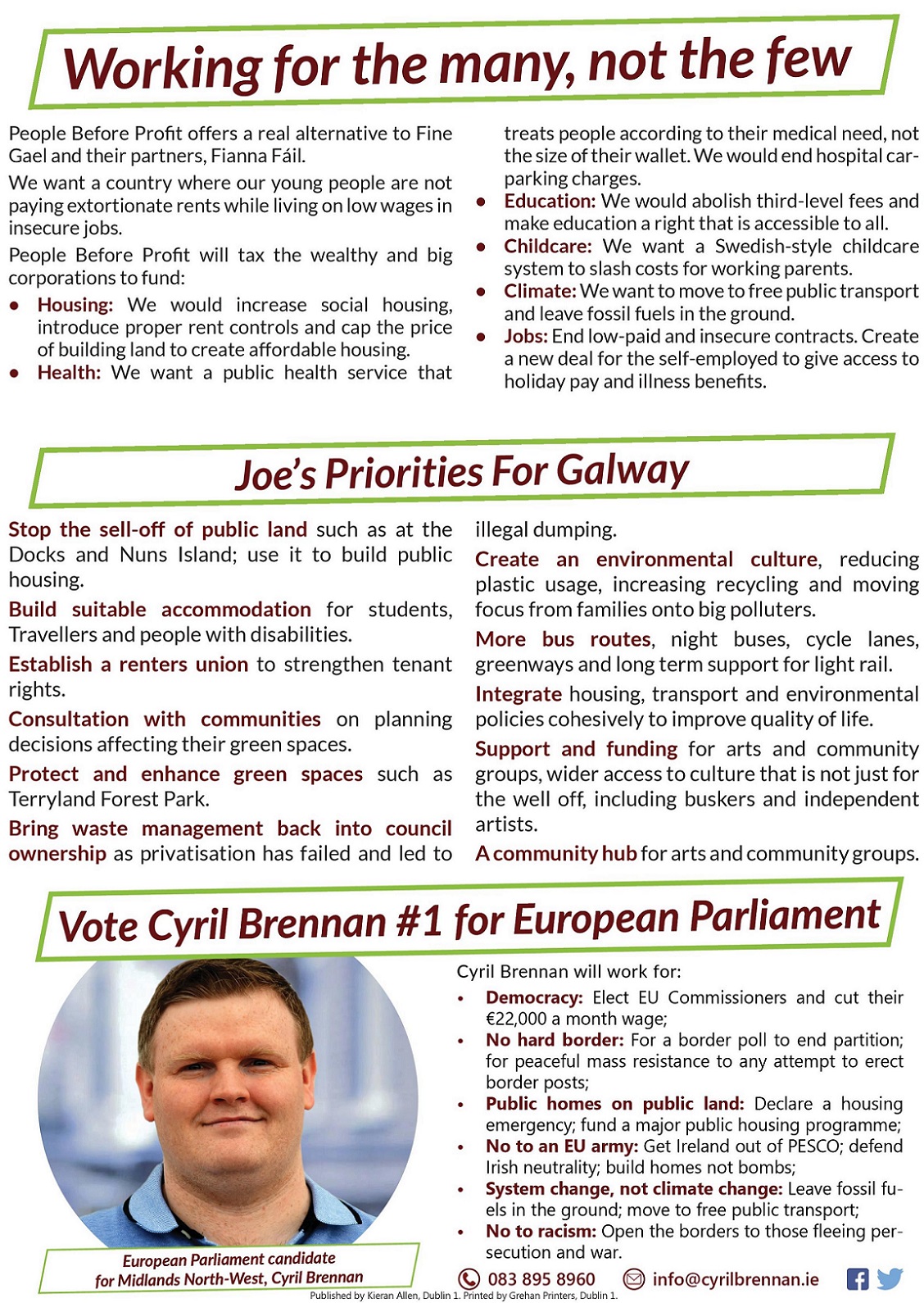 A Leaflet from Joe Loughnane who is running for People Before Profit in Galway City Central for a seat on Galway City Council.