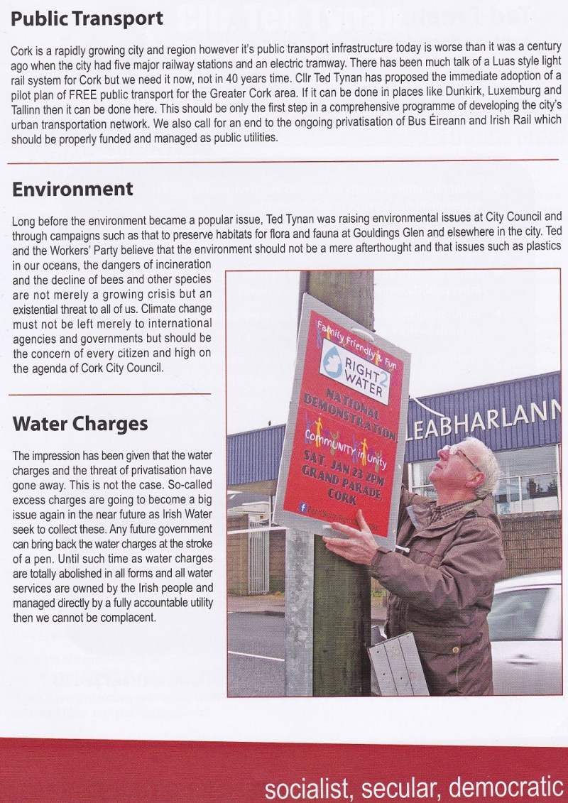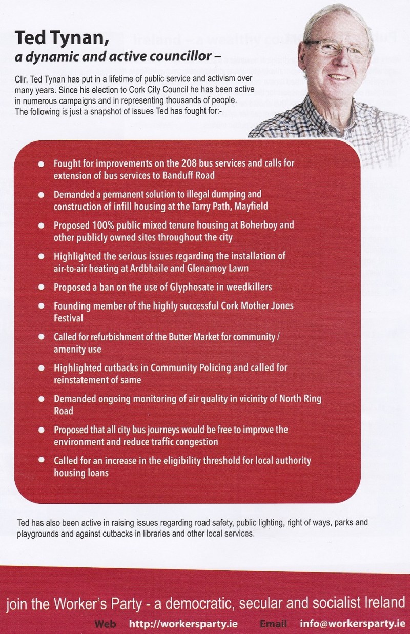 A Leaflet from Cllr Ted Tynan of The Workers’ Party who is running in Cork City North East to retain his seat on Cork City Council.