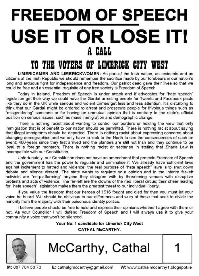 “Freedom Of Speech – Use It Or Lose It” leaflet from Cathal McCarthy – Limerick City West #LE19 » CathalMcCarthy1