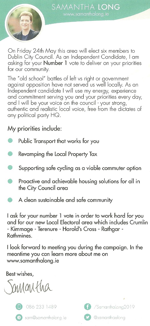Leaflet from Samantha Long -Independent – Kimmage Rathmines #LE19 » SamanthaLong2