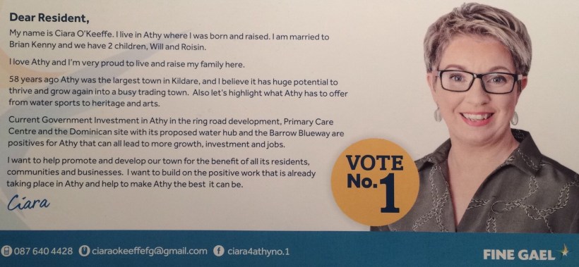 A Leaflet from Ciara O’Keefe who is running for Fine Gael in Athy for a seat on Kildare County Council.