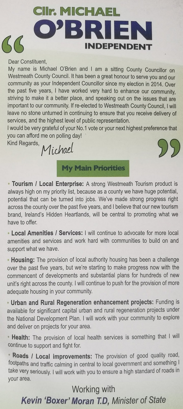 Leaflet from Michael O’Brien -Independent -Athlone (Westmeath) #LE19 » MichaelOBrien2