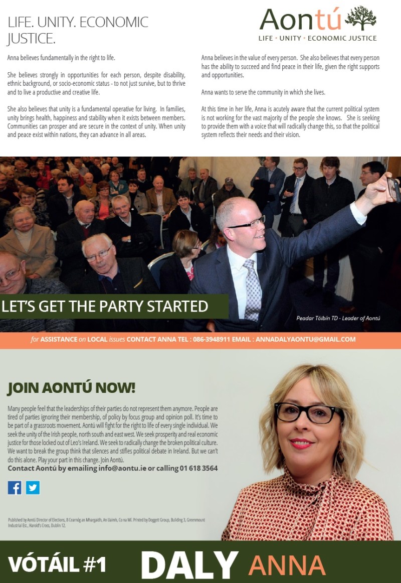 A Leaflet from Anna Daly of Aontú who is running in Cork City South East for a seat on Cork City Council.
