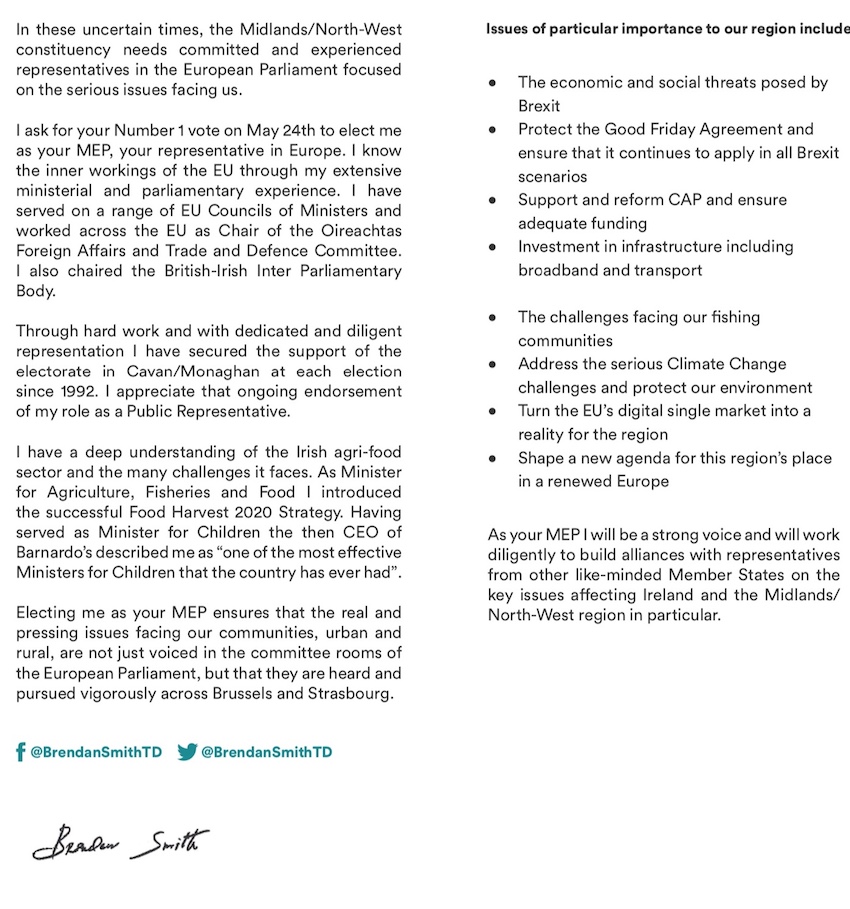 Leaflet from Brendan Smith – Fianna Fáil – Ireland North West #EP2019 » IMG_1387