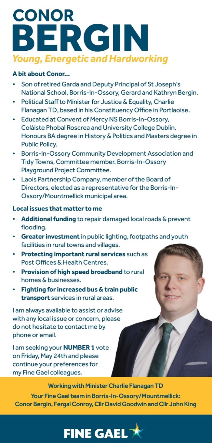 A Leaflet from Conor Bergin who is running for Fine Gael in the Borris in Ossory-Mountmellick LEA for a seat on Laois County Council.