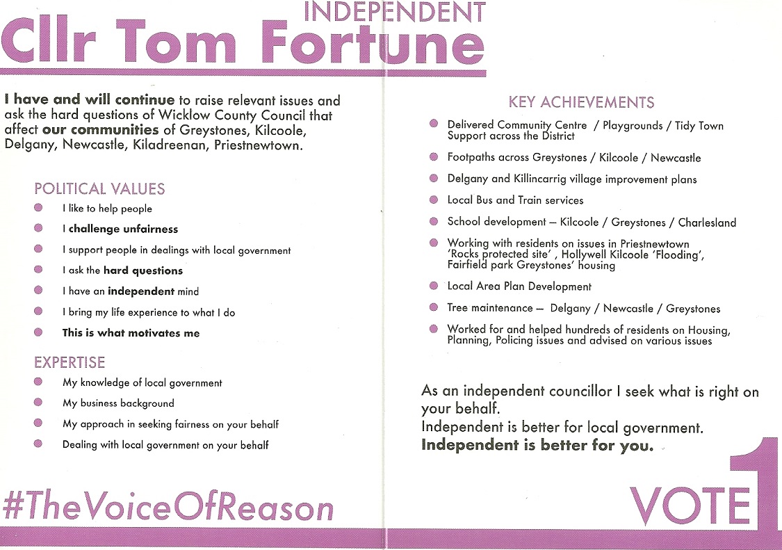 A Leaflet from Tom Fortune who is running as Independent in Greystones for a seat on Wicklow County Council.