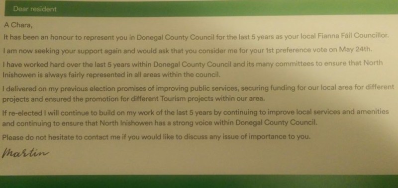 A Leaflet from Martin McDermott of Fianna Fáil running in Carndonagh to retain his seat on Donegal County Council.