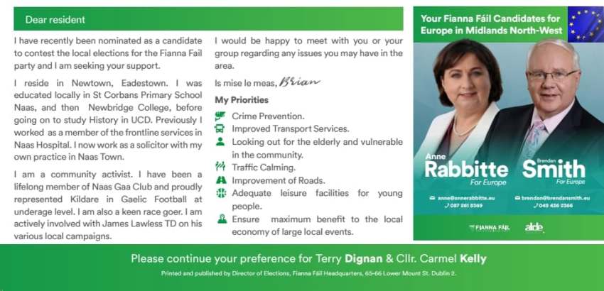 A Leaflet from Brian Larkin of Fianna Fáil running in Naas for a seat on Kildare County Council.