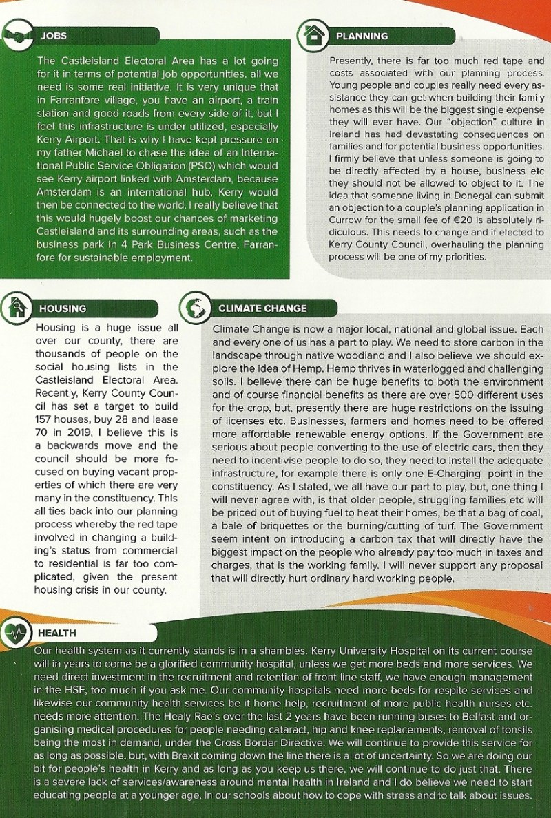 A Leaflet from Jackie Healy-Rae running as an Independent in the new Castleisland LEA for a seat on Kerry County Council.