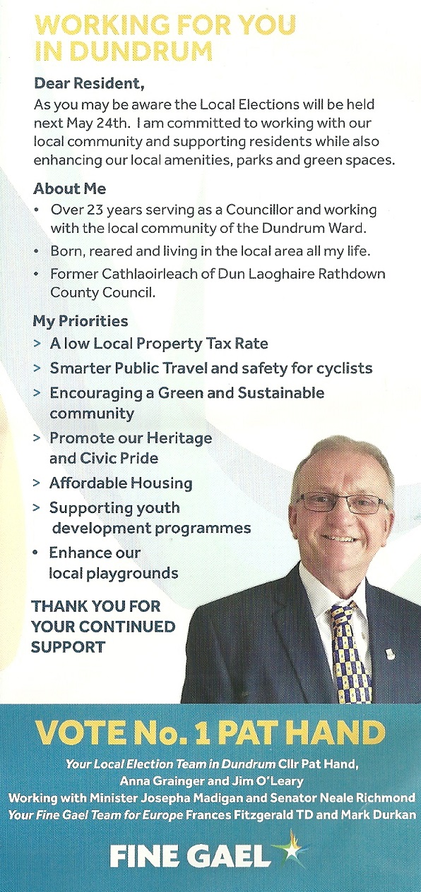 Leaflet from Pat Hand – Fine Gael – Dundrum #LE19 » PatHand2