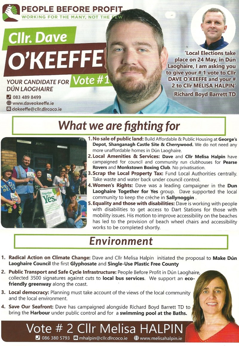 A Leaflet from Dave O’Keeffe of People Before Profit running in Dun Laoghaire.