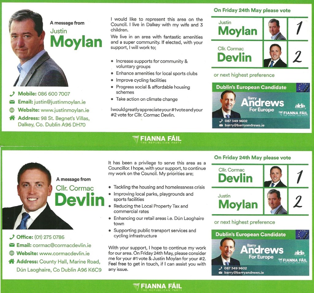 Leaflet from Justin Moylan and Cormac Devlin – Fianna Fáil – Dun Laoghaire #LE19 » JustinMoylanCormacDevlin