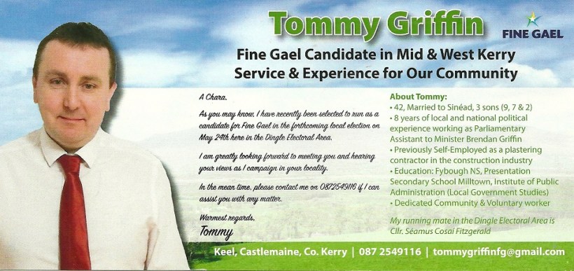 Bileog as Gaelige agus as Bearla from Tommy Griffin of Fine Gael running in An Daingean / Dingle for Kerry County Council