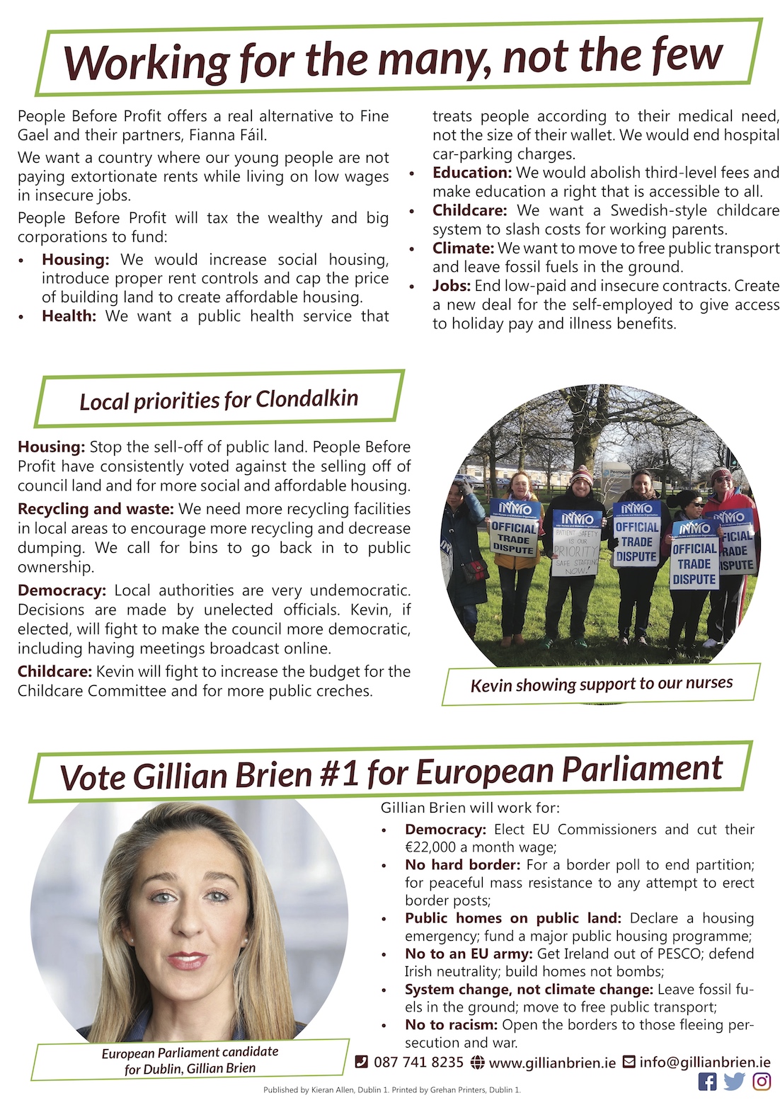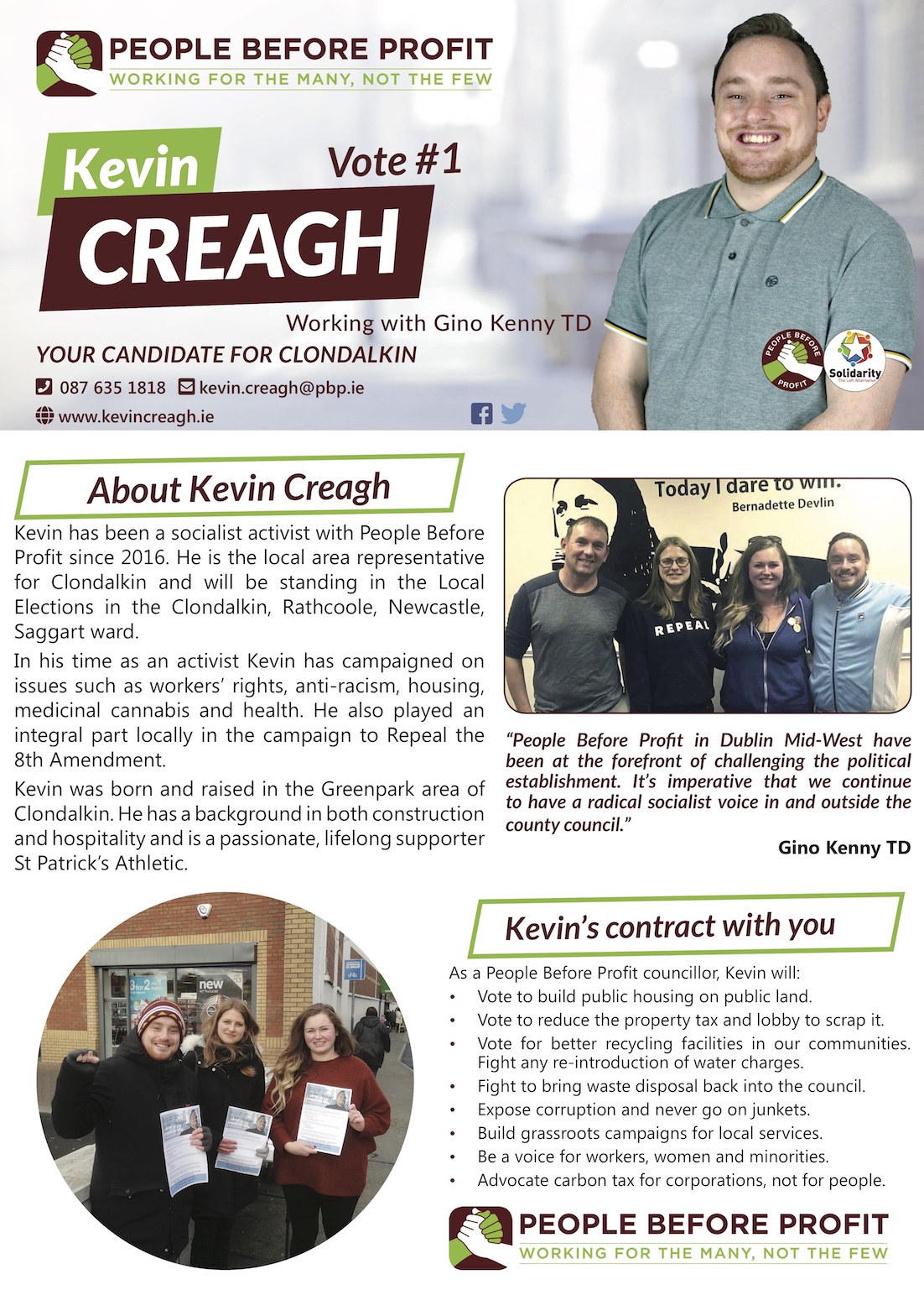 A Leaflet from Kevin Creagh running for People Before Profit in Clondalkin for a seat on South Dublin County Council.