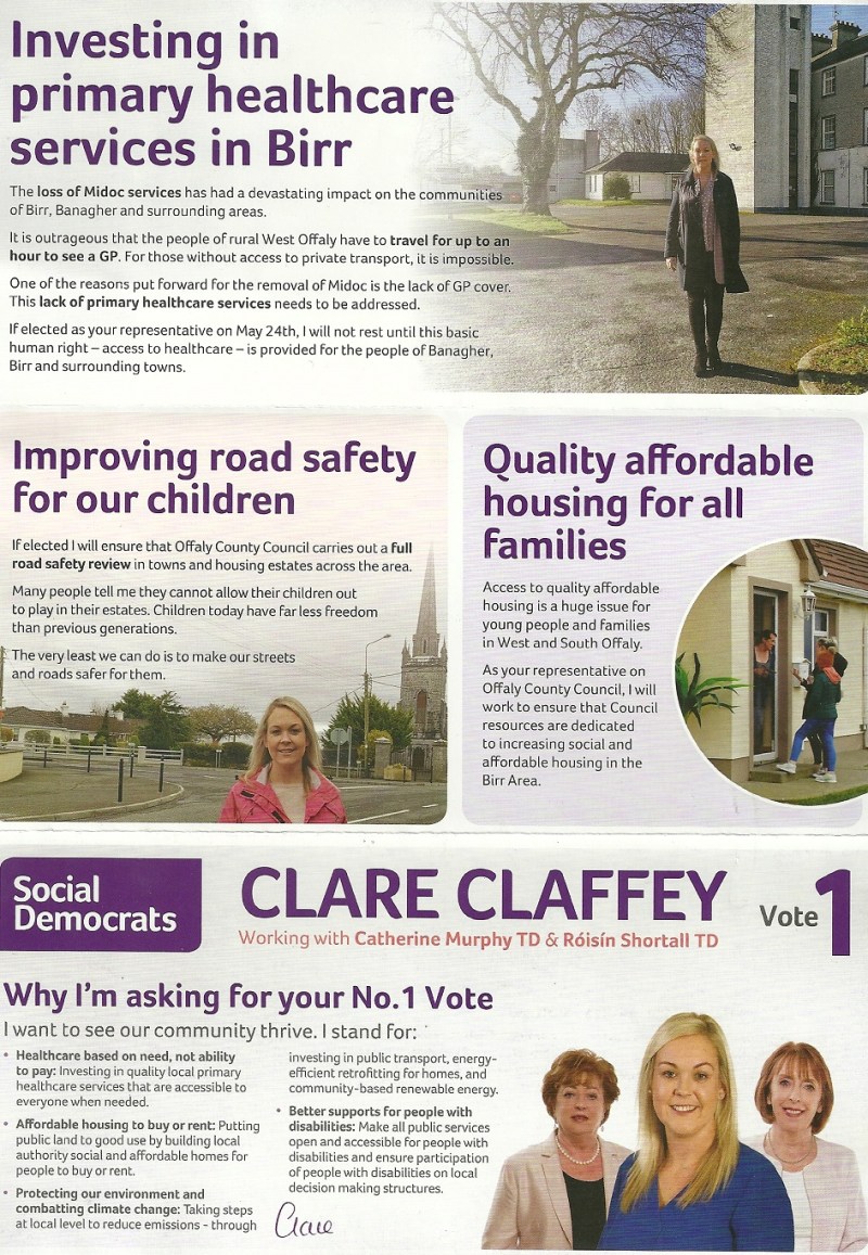 A Leaflet from Clare Claffey of The Social Democrats running in Birr for a seat on Offaly County Council.