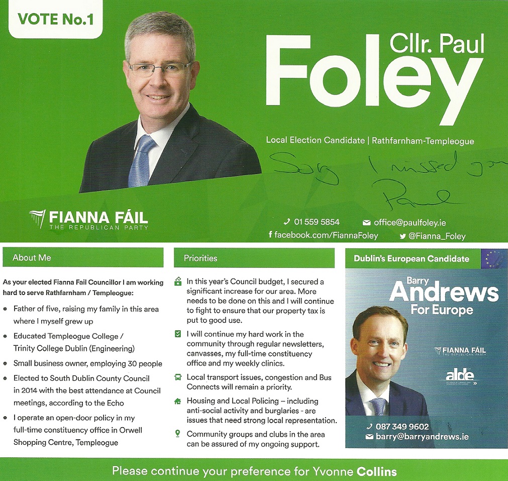 Leaflet from Paul Foley – Fianna Fáil -Rathfarnham Templeogue #LE19 » PaulFoley1