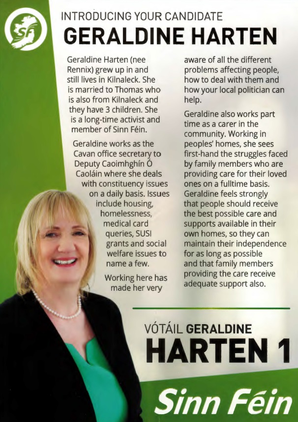 Leaflet from Geraldine Harten, Noel Connell – Sinn Féin – Ballyjamesduff #LE19 » GeraldineHarten2