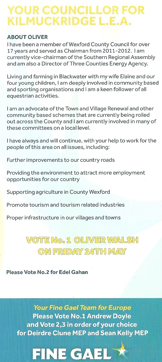 Leaflet from Oliver Walsh -Fine Gael – Kilmuckridge #LE19 » OliverWalsh2