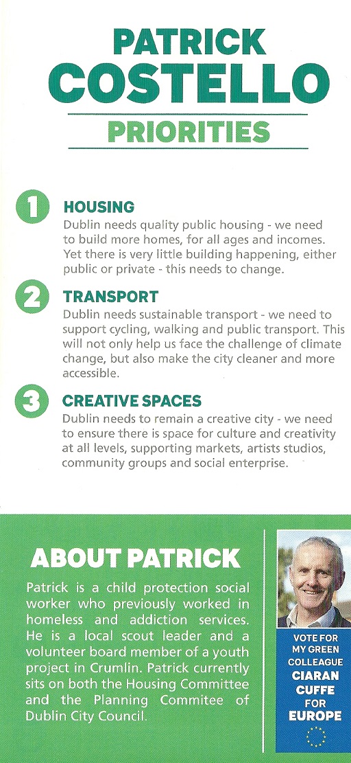 Leaflet from Patrick Costello – Green Party -Kimmage Rathmines #LE19 » PatrickCostello2