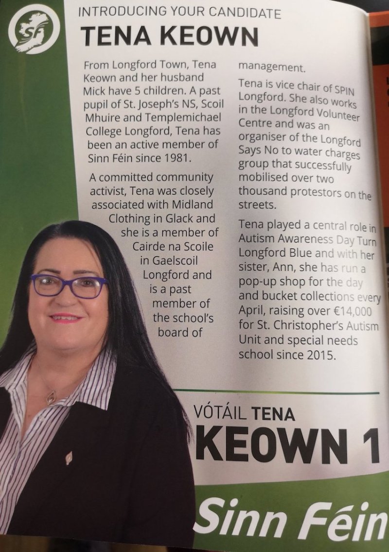 A Leaflet from Tena Keown of Sinn Féin running in the Longford LEA for a seat on Longford County Council.