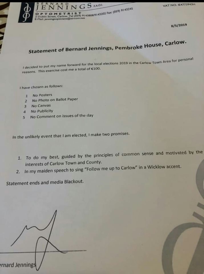 Press Release from Bernard Jennings -Independent- Carlow » BernardJennings